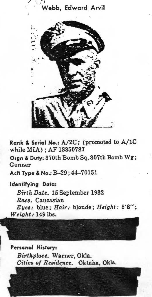 information. (FEBRUARY 1992) Edward Webb is listed on the "HONOR ROLL OF FORGOTTEN AMERICANS" yet is noted as having died "while missing" by the National Archive. |