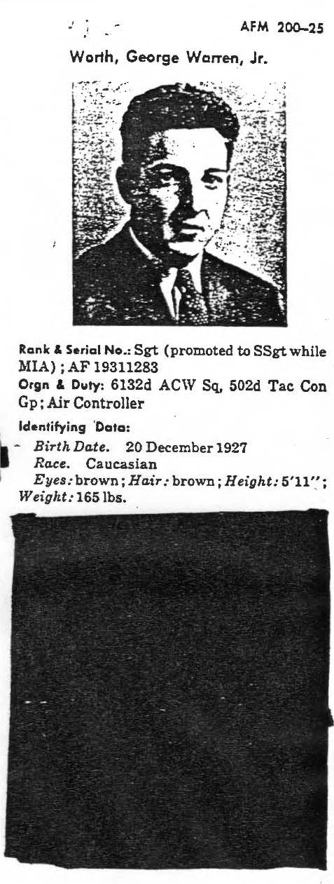 information. (FEBRUARY 1992) George Worth Jr. is listed on the "HONOR ROLL OF FORGOTTEN AMERICANS" yet is noted as having died "while missing" by the National Archive. |