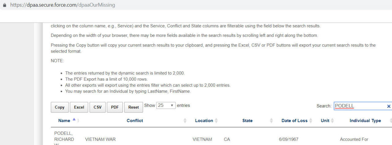 | Podell was not on the POW/MIA lists. Nor are "The lost crew included pilot CAPT Rafael L. Rivera-Balaguer, co-pilot CAPT Jerome F. Starkweather, navigator CAPT Richard W. Podell, loadmaster SSGT Ricky L. Herndon, and flight engineers SSGT Ira E. Scott and SSGT William E. Tyree. Its passengers (all U.S. Army) were 1LT Richard A. Gray, SP5 Frank R. Ragusa, SP4 Craig R. Schoenbaum, and SP5 Andrew H. Shimp. " His name is NOT on the Indiana Accounted for nor Unaccounted for Indiana Lists. He IS noted as accounted for if you use DPAA search feature in their web page. The others are not. |