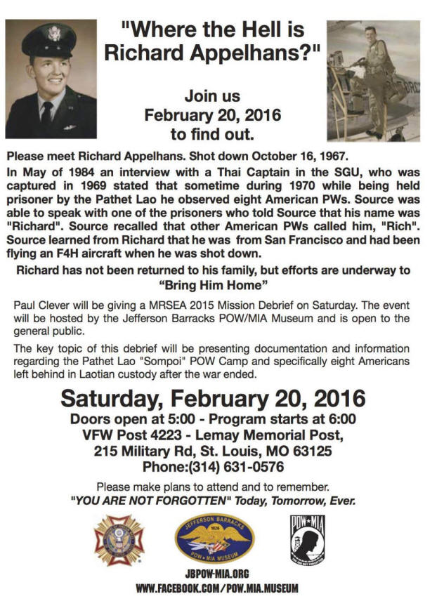 Captain Richard Duane Appelhans entered the U.S. Air Force from Montana and served in the 12th Tactical Reconnaissance Squadron. He was the pilot of the Phantom when it went missing and his remains were not recovered. Subsequent to the incident, and while carried in the status of missing in action (MIA), the U.S. Air Force promoted captain Appelhans to the rank of Lieutenant Colonel (Lt Col). Today, Lieutenant Colonel Appelhans is memorialized on the Courts of the Missing at the National Memorial Cemetery of the Pacific.