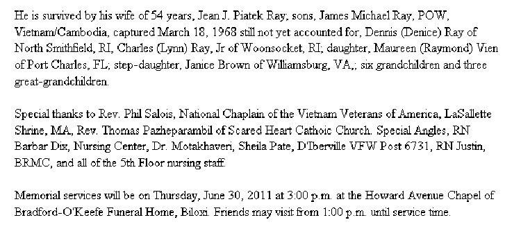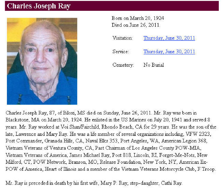 Today I received the sad news that a dear old friend, Charlie Ray, a World War II Marine Corps veteran, who served in the Pacific during World War II, the father of Jimmy Ray, POW 3/18/68, and who with his wife Jean has been dedicated to the cause of our prisoners of war for over 4 decades, departed this earthly existence early yesterday afternoon (June 26, 2011).