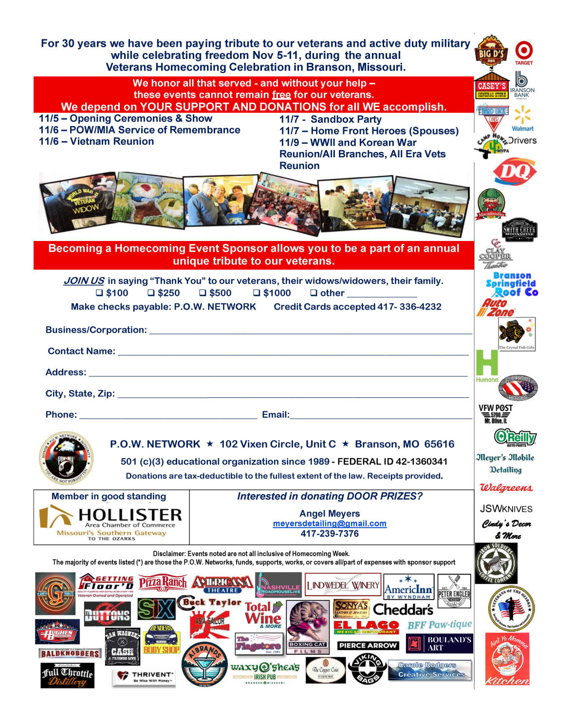 SPONSORS NEEDED FOR 2026 ! Donations are tax deductible. The P.O.W. Network is a 501 3c educational organization.