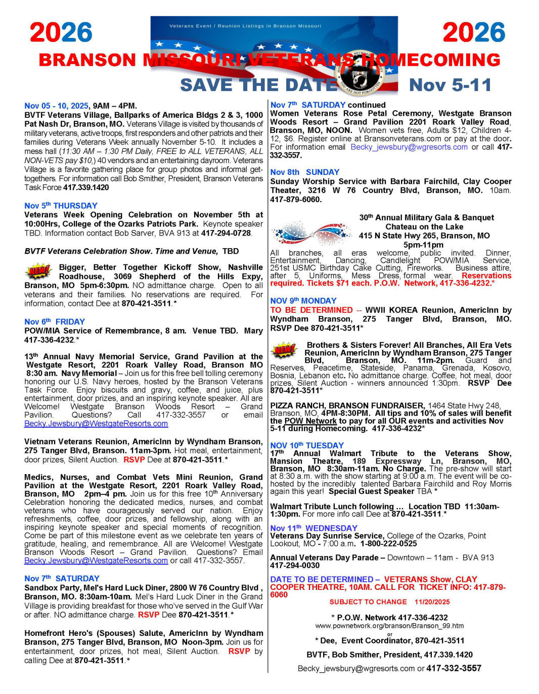 Events posted are subject to change, and event and information flyers are available all over Branson during Homecoming. POW NETWORK RESERVES THE RIGHT TO REFUSE ADMISSION TO ANYONE AT THEIR HOSTED/SPONSORED/PARTNERED EVENTS. |